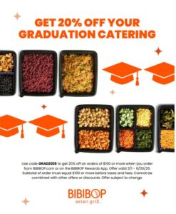 Celebrate your graduation events with Bibibop Asian Grill Catering and enjoy a special 20% discount for a limited time.